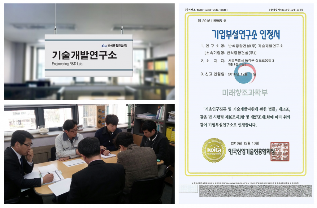 [공지사항] 반석종합건설(주) 기업부설연구소 설립 2016.12.13 22:45 반석종합건설 조회 수1925 반석종합건설(주)는 25년간 축적된 노하우와 우수한 기술력을 바탕으로 건축 문화와 기술을 선도하며 건축기술에 대한 연구개발에 적극적으로 힘쓰기 위해 기업부설 기술개발연구소를 설립했다. 또한 본 연구소는 미래창조과학부에서 기초연구진흥 및 기술개발지원에 관한 법률 제 14조 외 법으로 인증하는 기업부설인정서를 최득했다. wp-image-2935″ /> 목록보기 이전글 다음글